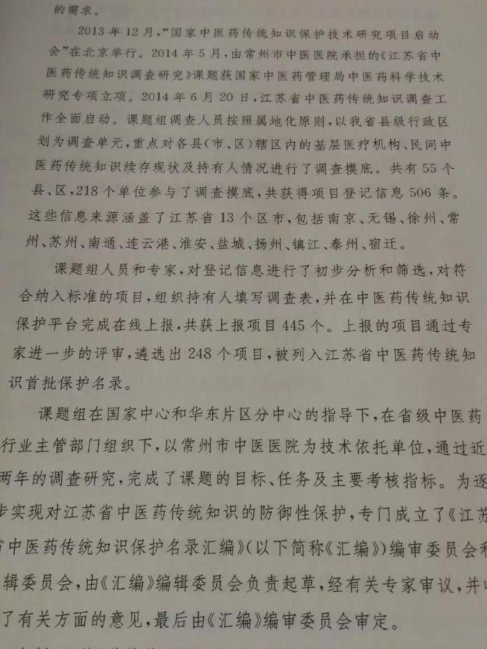 四、下面截图是《江苏省中医药传统知识保护名录汇编》的前言部分内容,阐述历经三年的搜集、调查及评定标准和严谨收录的过程:浏览下面的内容不清楚时,可用手指点击图片,然后再放大来查阅: