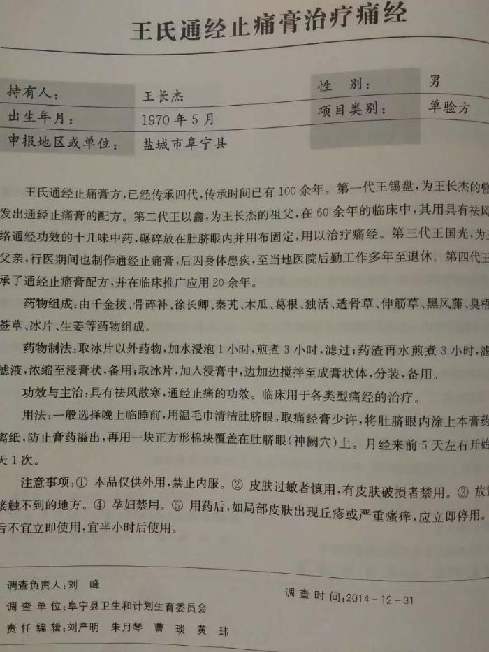 五、下面截图中内容是王长杰医生的治疗痛经(子宫腺肌症)的一种外用膏方被《江苏省中医药传统知识保护名录汇编》收录在第132页: