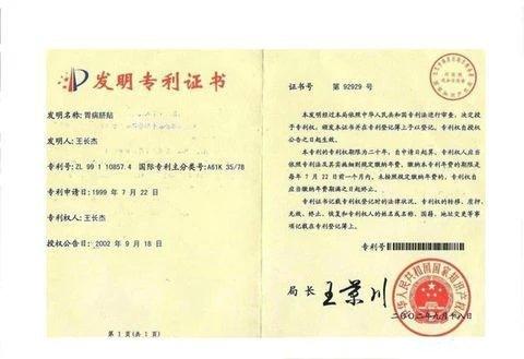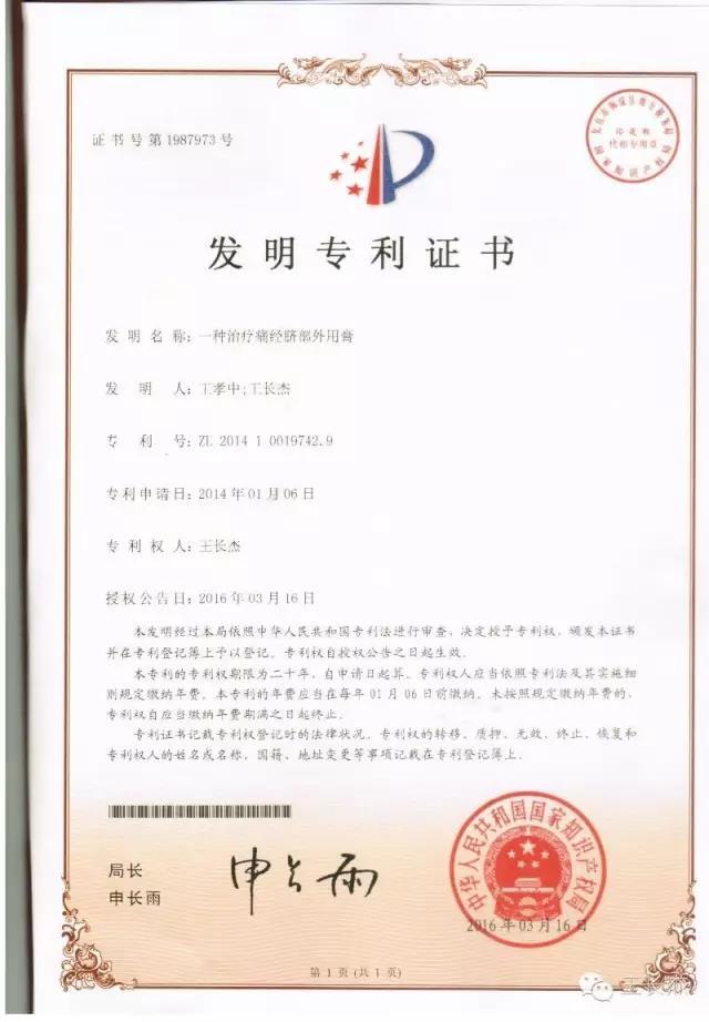 二、下图的证件:是在2016年3月16日国家知识产权局授予王长杰医生研发的“痛经脐部外用膏”国家中药发明专利证书: