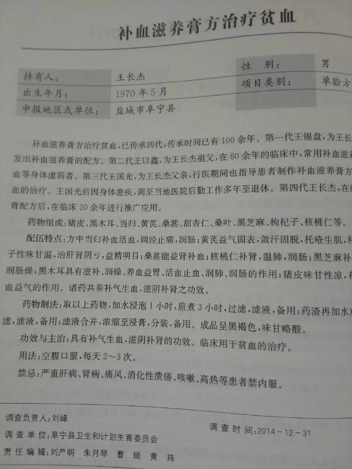六、下面截图内容是王长杰医生的数代人治疗气血不足(贫血的一种)的中药膏方被《江苏省中医药传统知识保护名录汇编》收录在第172页: