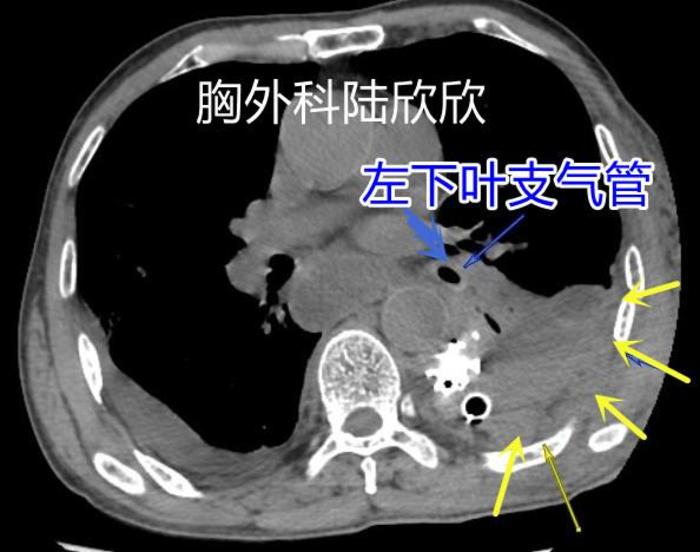 上图为图6。为术后第九天的CT。可见两个蓝色箭头指示的是左下叶支气管,再往下支气管就被堵死了。黄色箭头指示的是肺不张。