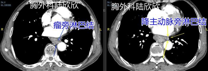 上图为图3。是肿瘤的上极的两个不同平面。上面左边的图,可见一枚瘤旁淋巴结肿大,两个蓝色箭头指示的是一枚瘤旁淋巴结,8毫米,球形,看起来像是转移淋巴结,术后病理证实为转移淋巴结。最右边的黄色箭头指示的是肿瘤周围、降主动脉旁的小淋巴结。这个淋巴结手术是否转移难定,最终术后病理证实为转移淋巴结。