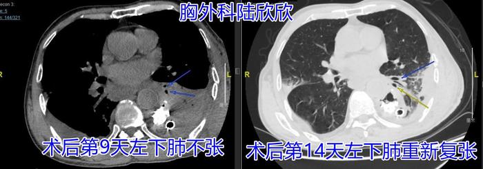 上图为图7。左图是为术后第九天的CT。可见两个蓝色箭头指示的是左下叶支气管,远端肺不张。右图是为术后第十四天的CT。可见两个蓝色箭头指示的是左下叶支气管,远端肺重新复张。