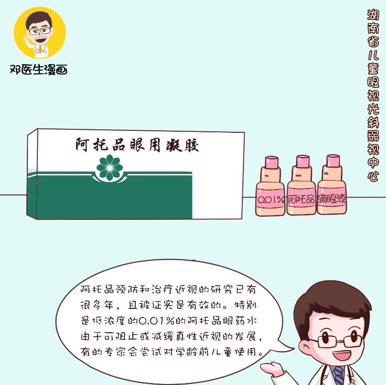 对阿托品预防和治疗近视的研究已有很多年,且被证实是有效的。特别是低浓度的0.01%的阿托品眼药水由于可阻止或减缓真性近视的发展,而副作用又在可被接受的范围内,而在近年来得到大家的关注。但是由于国内的阿托品药水浓度都比较高,麻痹睫状肌作用强,持续时间久,会导致眼睛瞳孔散大,造成使用者畏光,看近不清,甚至少数有眼红、眼压升高及全身副作用。因此,在中国大陆很少使用阿托品来控制近视,有的专家会尝试对学龄前儿童使用。